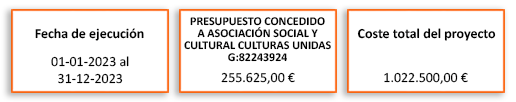 Proyecto en agrupación con Asociación Social y Cultural Culturas Unidas: G82243924, Asociación Transexual Española – Transexualia: G79281069, Asociación Social y Cultural Casa de Paz: G80366909 y Asociación Innicia I+D Social y Colaborativo: G87710059.